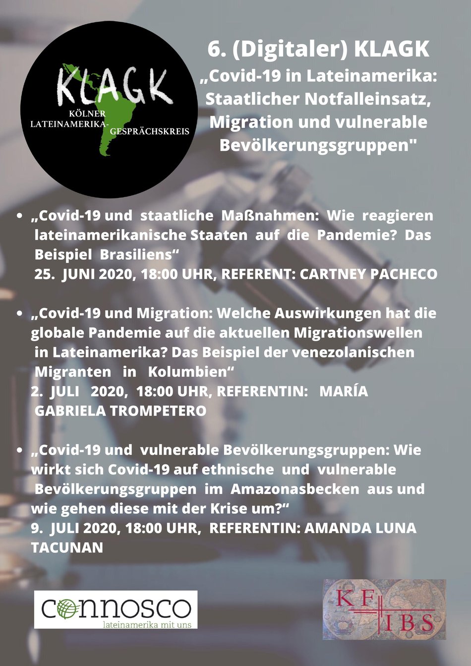 Bereits zum 6. Mal laden wir Sie gemeinsam mit unserem Kooperationspartner KFIBS (Kölner Forum für Internationale Beziehungen und Sicherheitspolitik e. V.) zum Kölner Lateinamerika Gesprächskreis, kurz KLAGK, ein. Diesmal wird das Format mit dem Thema „Covid-19 in Lateinamerika: Staatlicher Notfalleinsatz, Migration und vulnerable Bevölkerungsgruppen“ in digitaler Form stattfinden und auf drei Termine verteilt. Weitere Informationen zu den Terminen, Themen und Referierenden finden Sie unter https://www.connosco.de/deutsch/veranstaltungen/klagk/.